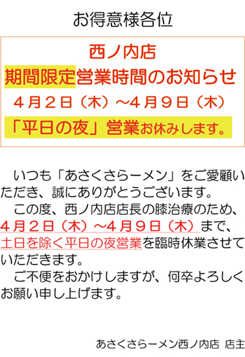 「いつも「あさくさらーメン」をご愛顧いただき、誠にありがとうございます。 この度、西ノ内店店長の膝治療のため、4月2日(木)〜4月9日(木)まで、土日を除く平日の夜営業を臨時休業させていただきます。 ご不便をおかけしますが、何卒よろしくお願い申し上げます。 あさくさらーメン西ノ内店 店主 ![]() |
